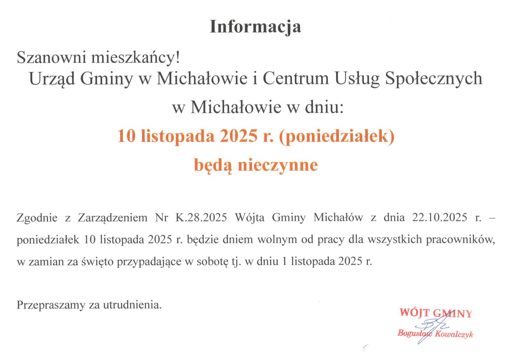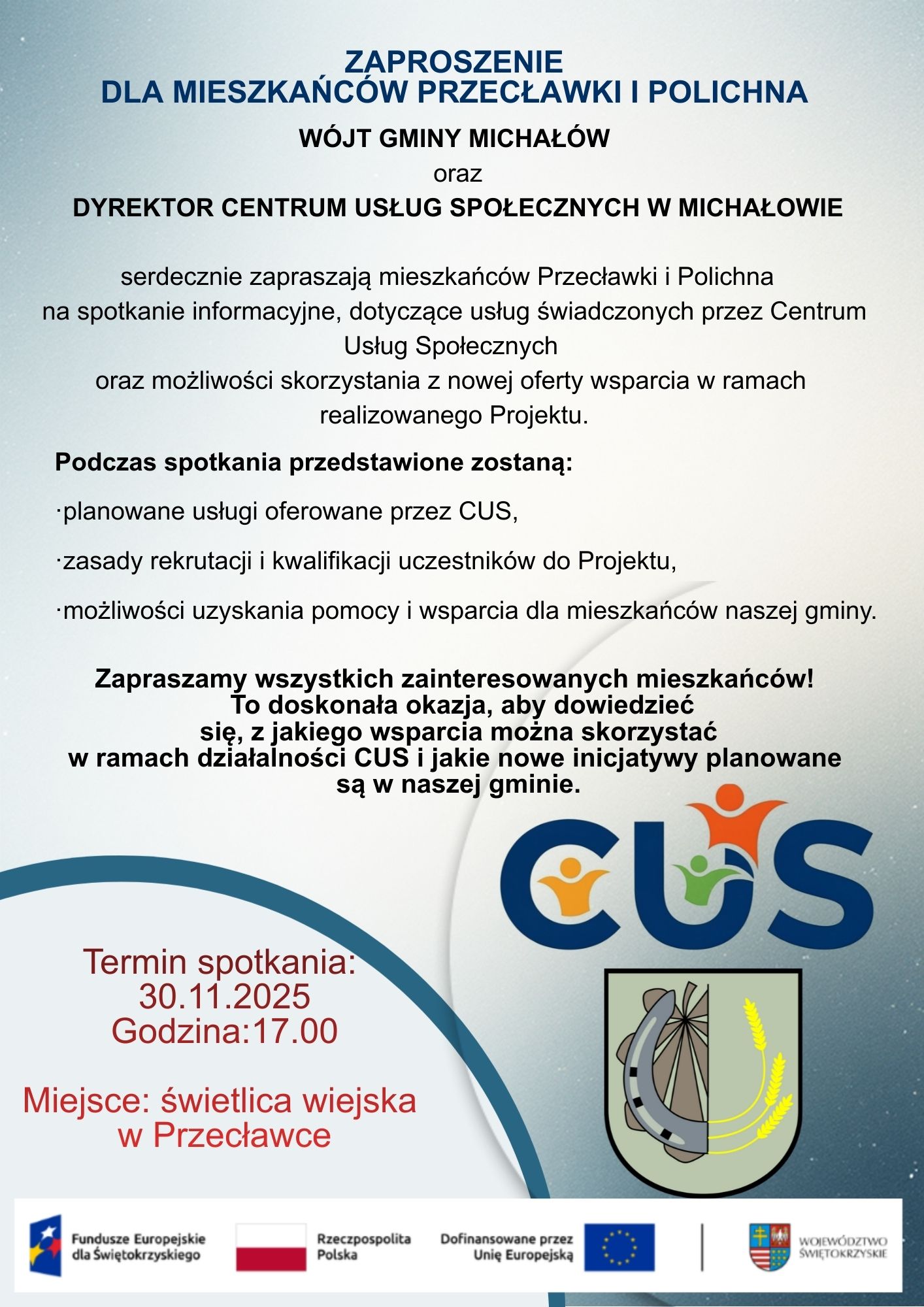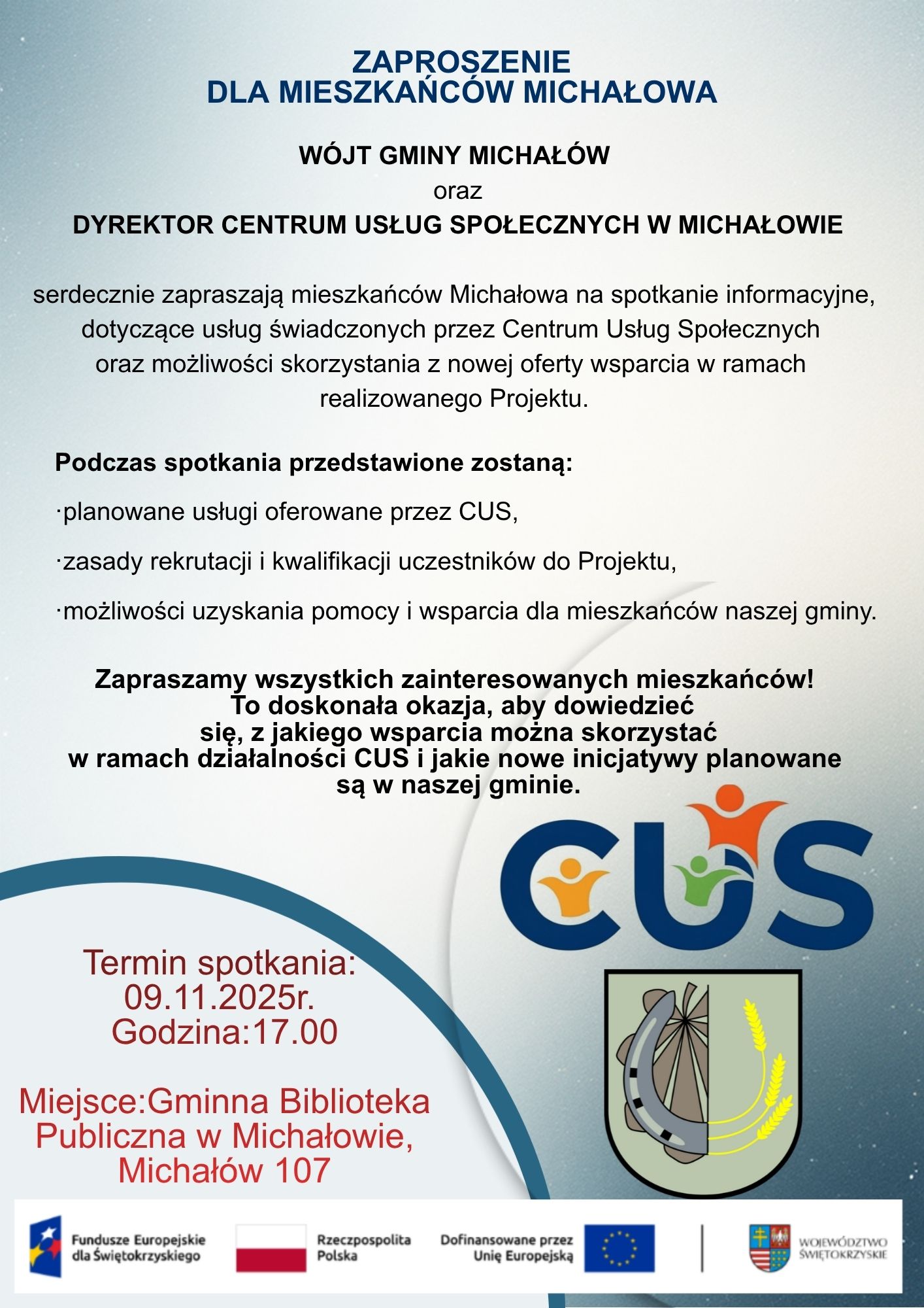 WÓJT GMINY MICHAŁÓW oraz DYREKTOR CENTRUM USŁUG SPOŁECZNYCH W MICHAŁOWIE serdecznie zapraszają mieszkańców Michałowa na spotkanie informacyjne, dotyczące usług świadczonych przez Centrum