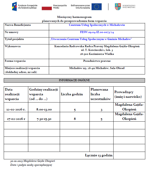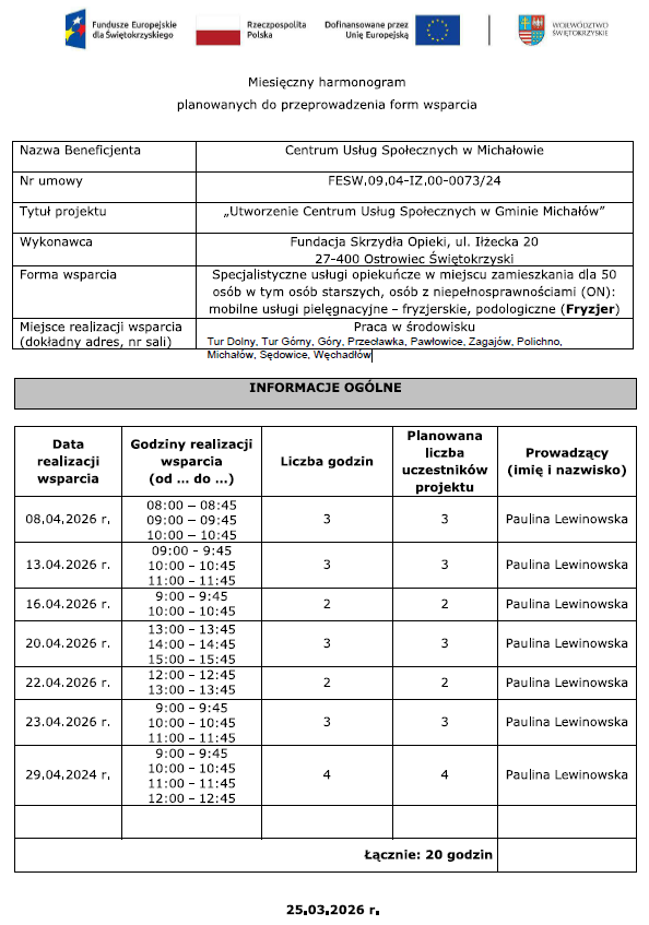 Projekt pn. „Centrum Usług Społecznych w Gminie Michałów” realizowany na podstawie umowy o dofinansowanie nr umowy: FESW.09.04-IZ.00-0073/24 zawartej z Województwem Świętokrzyskim reprezentowanym przez Zarząd Województwa pełniącym funkcję Instytucji Zarządzającej programem regionalnym Fundusze Europejskie dla Świętokrzyskiego 2021-2027.