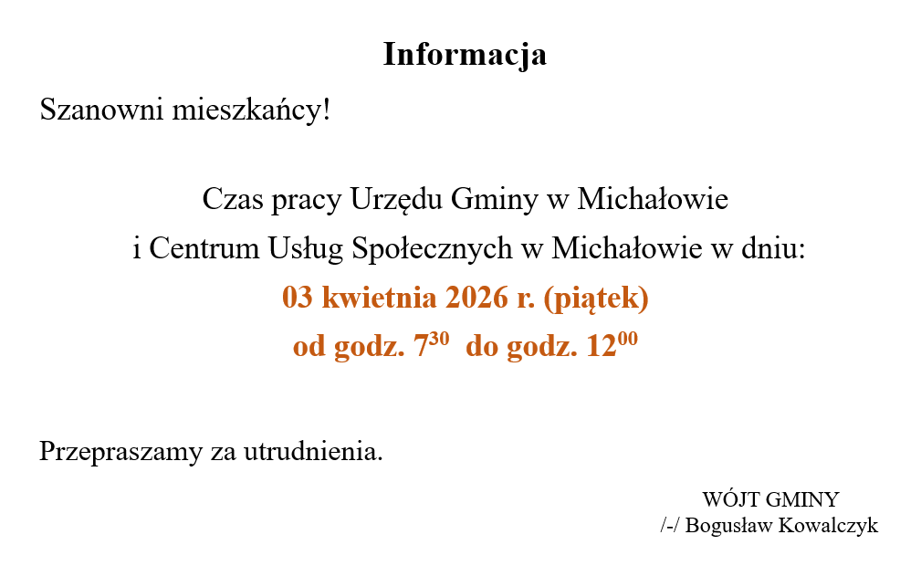 Szanowni mieszkańcy! Czas pracy Urzędu Gminy w Michałowie i Centrum Usług Społecznych w Michałowie w dniu: 03 kwietnia 2026 r. (piątek) od godz. 730 do godz.
