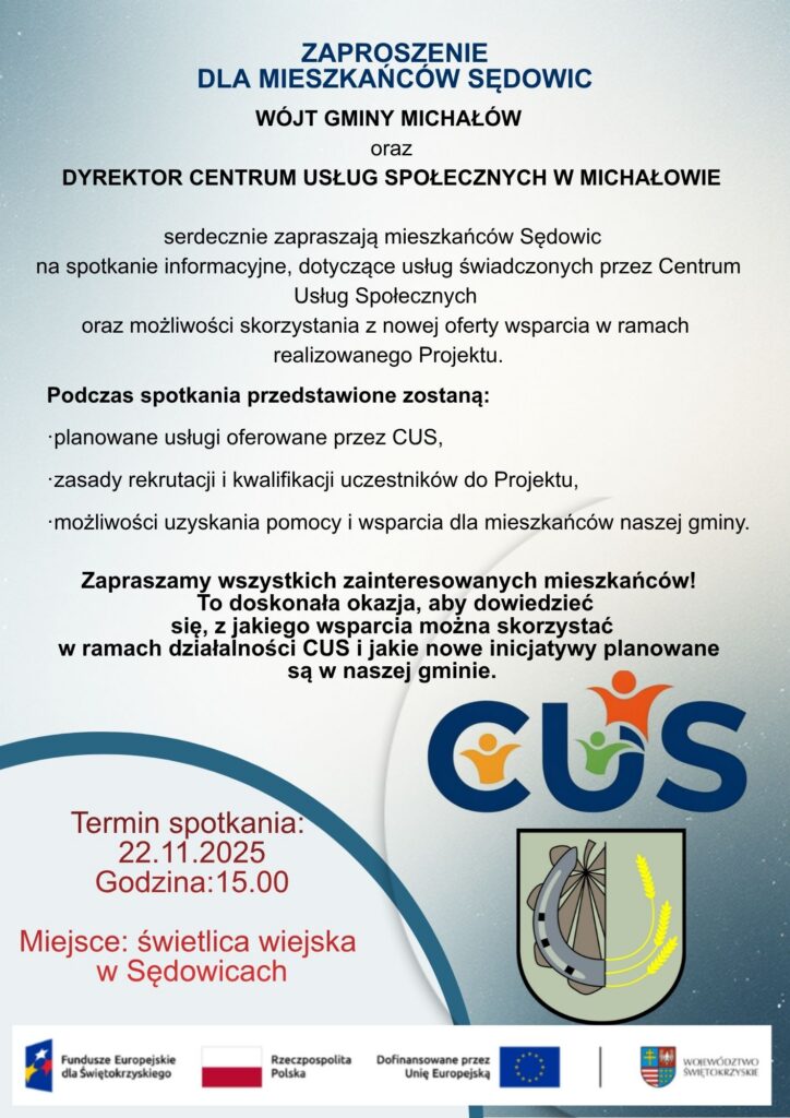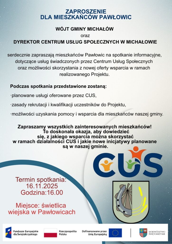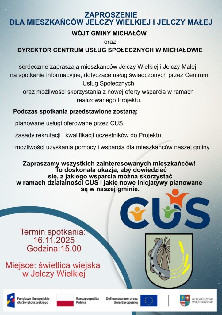 WÓJT GMINY MICHAŁÓWorazDYREKTOR CENTRUM USŁUG SPOŁECZNYCH W MICHAŁOWIE serdecznie zapraszają mieszkańców Wrocieryża na spotkanie informacyjne, dotyczące usług świadczonych przez Centrum Usług Społecznych oraz możliwości skorzystania z nowej oferty wsparcia w ramach realizowanego Projektu. Podczas spotkania przedstawione zostaną: Termin spotkania: 22.11.2025r.Godzina: 16.00Miejsce: spotkanie świetlica wiejska we Wrocieryżu Zapraszamy wszystkich zainteresowanych mieszkańców!To doskonała okazja, aby dowiedzieć się, z jakiego wsparcia można skorzystać w ramach działalności […]