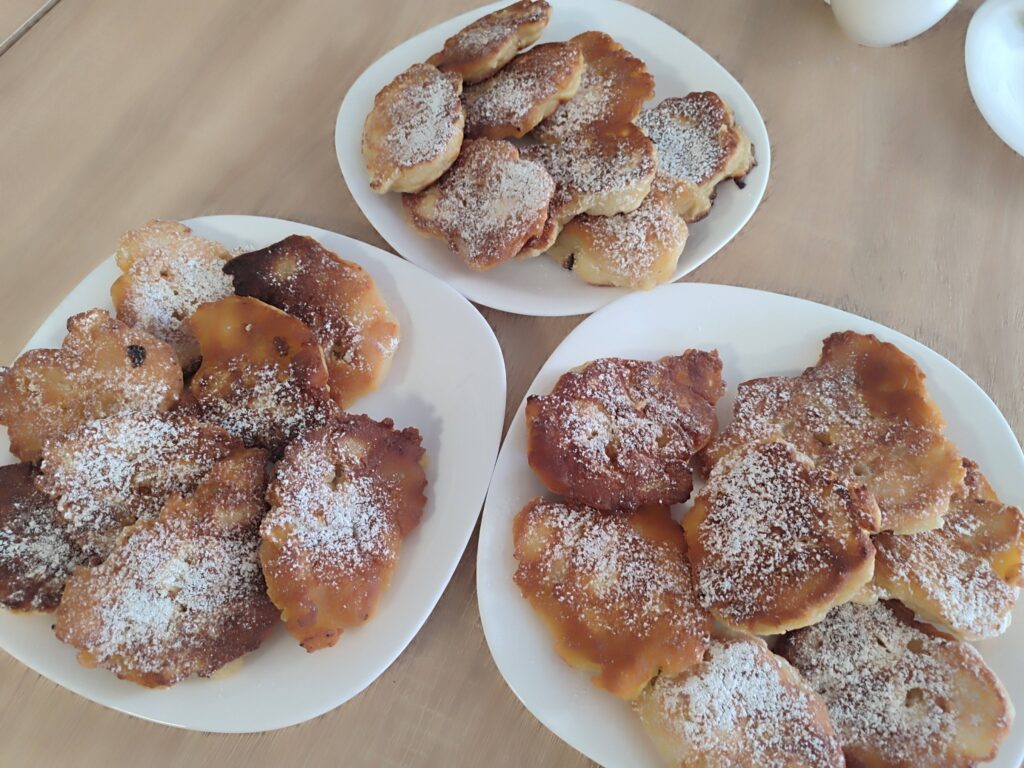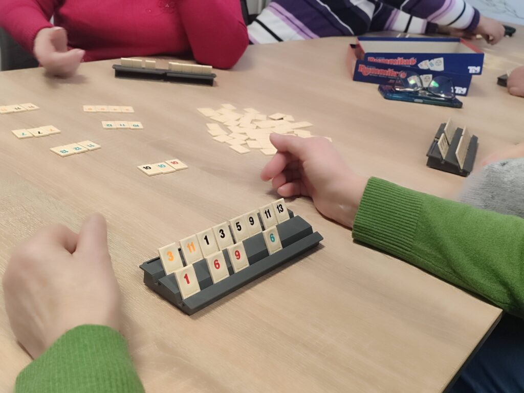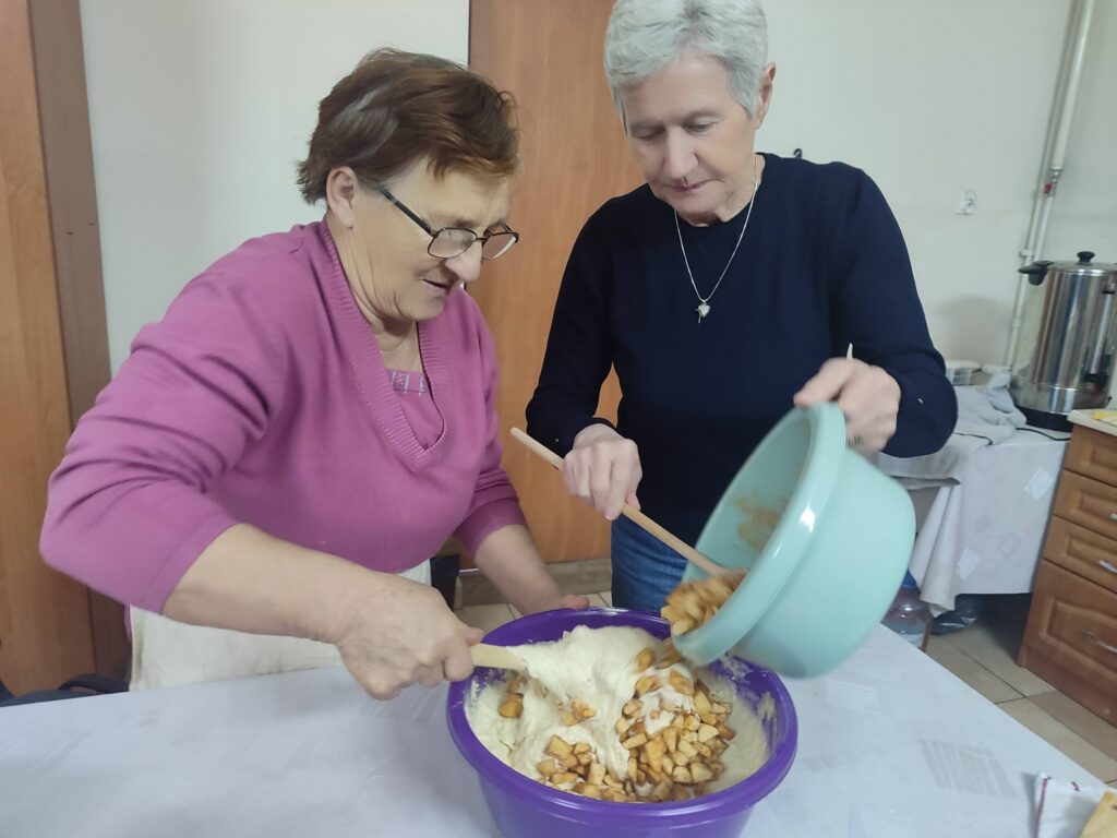 Podczas ostatnich zajęć uczestnicy mieli okazję spędzić czas przy grach planszowych, które sprzyjają integracji, ćwiczeniu pamięci oraz zdrowej rywalizacji. Dużym zainteresowaniem cieszyły się również warsztaty kulinarne, podczas których wspólnie przygotowaliśmy tradycyjne racuchy z jabłkami. Zapach domowych wypieków i smak znanych potraw przywołały wiele miłych wspomnień.
