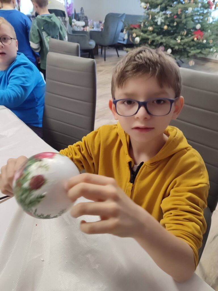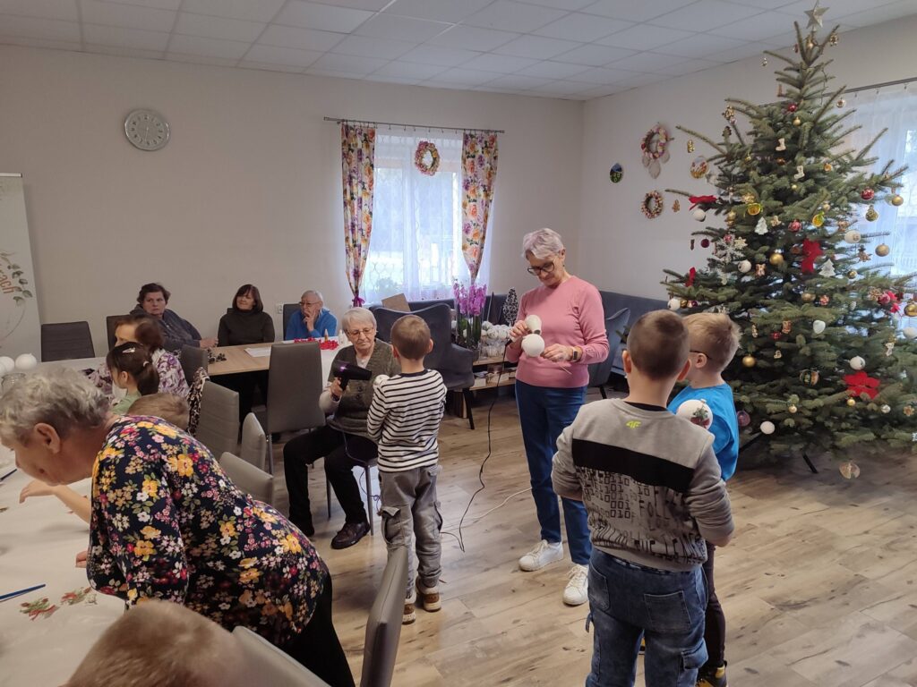 Uczestnicy wspólnie wykonywali świąteczne bombki w technice decoupage, wykazując się ogromną kreatywnością i wyobraźnią. Dzieci z zaangażowaniem ozdabiały bombki, a seniorzy chętnie dzielili się swoimi umiejętnościami oraz opowieściami związanymi ze świątecznymi tradycjami.