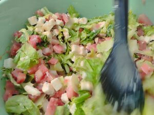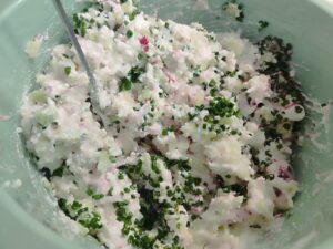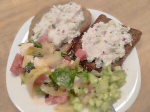 Po części teoretycznej przyszedł czas na praktykę – wspólnie przygotowaliśmy sałatkę oraz pyszną pastę z białego serka, ogórków, rzodkiewki i szczypiorku. Było zdrowo, kolorowo i bardzo smacznie!